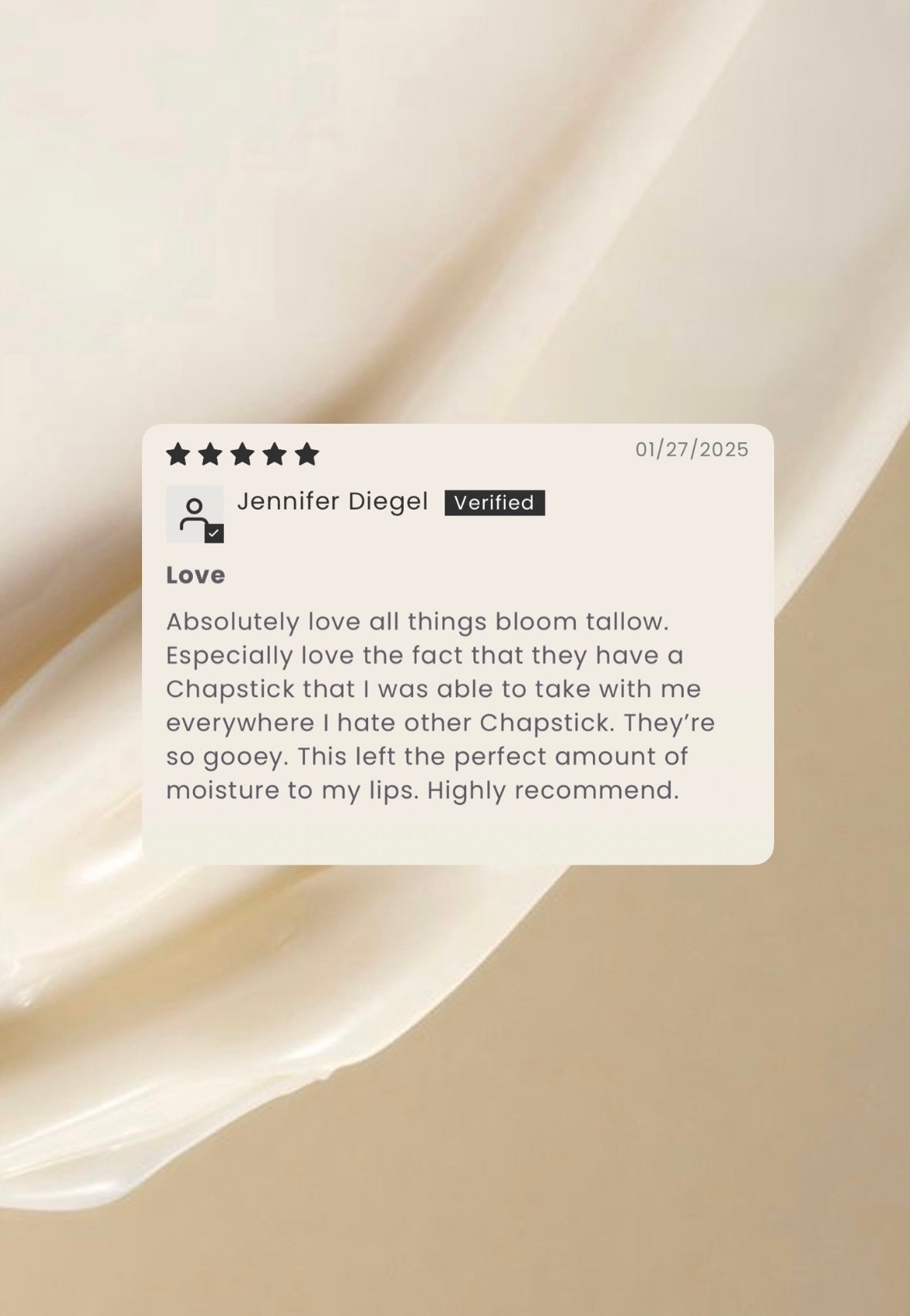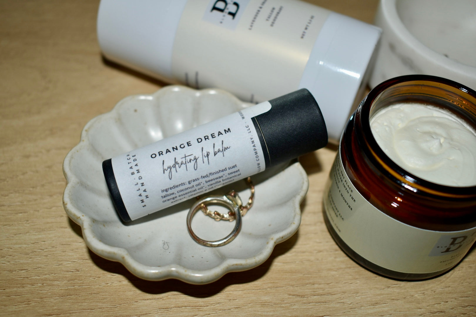 This hydrating lip balm is made from three main simple ingredients: grass-fed/finished suet tallow, organic beeswax, & organic, cold-pressed virgin coconut oil. Made for extreme hydration on the go, a must-have in everyone's bag.
